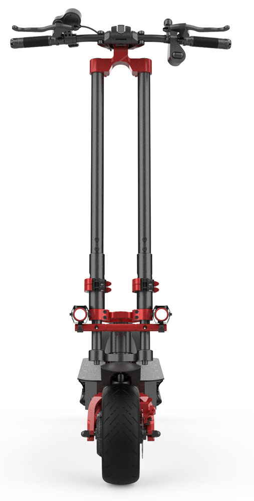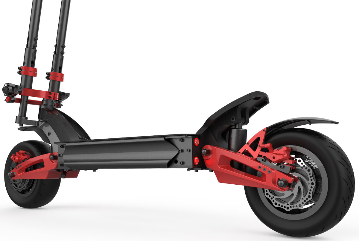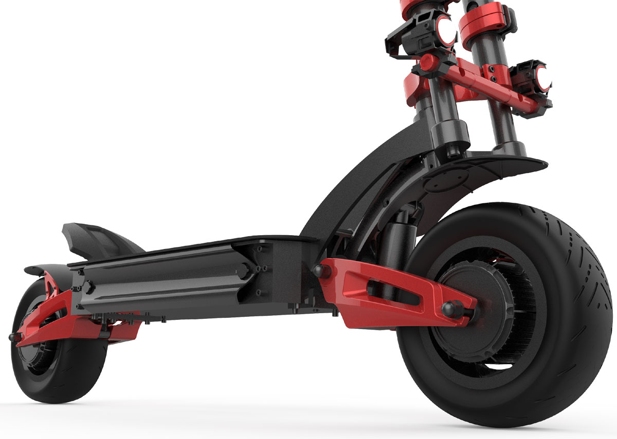 Ogromna łączna moc silników (3200W), umożliwia uzyskanie prędkości nawet 100 km/h i pokonywanie 35% wzniesień. Tak szybkie hulajnogi muszą mieć bardzo dobre hamulce i dobre zawieszenie, i wygląda na to, że oba pojazdy takie mają, bo zawieszenie jest półhydrauliczne, a hamulce tarczowe hydrauliczne na obu kołach. Koła są 11 calowe, pompowane, posiadają bieżnik ułatwiający jazdę w terenie. Dobrą widoczność w nocy powinny zapewnić dwa reflektory LED z przodu oraz cztery czerwone światła LED z tyłu.